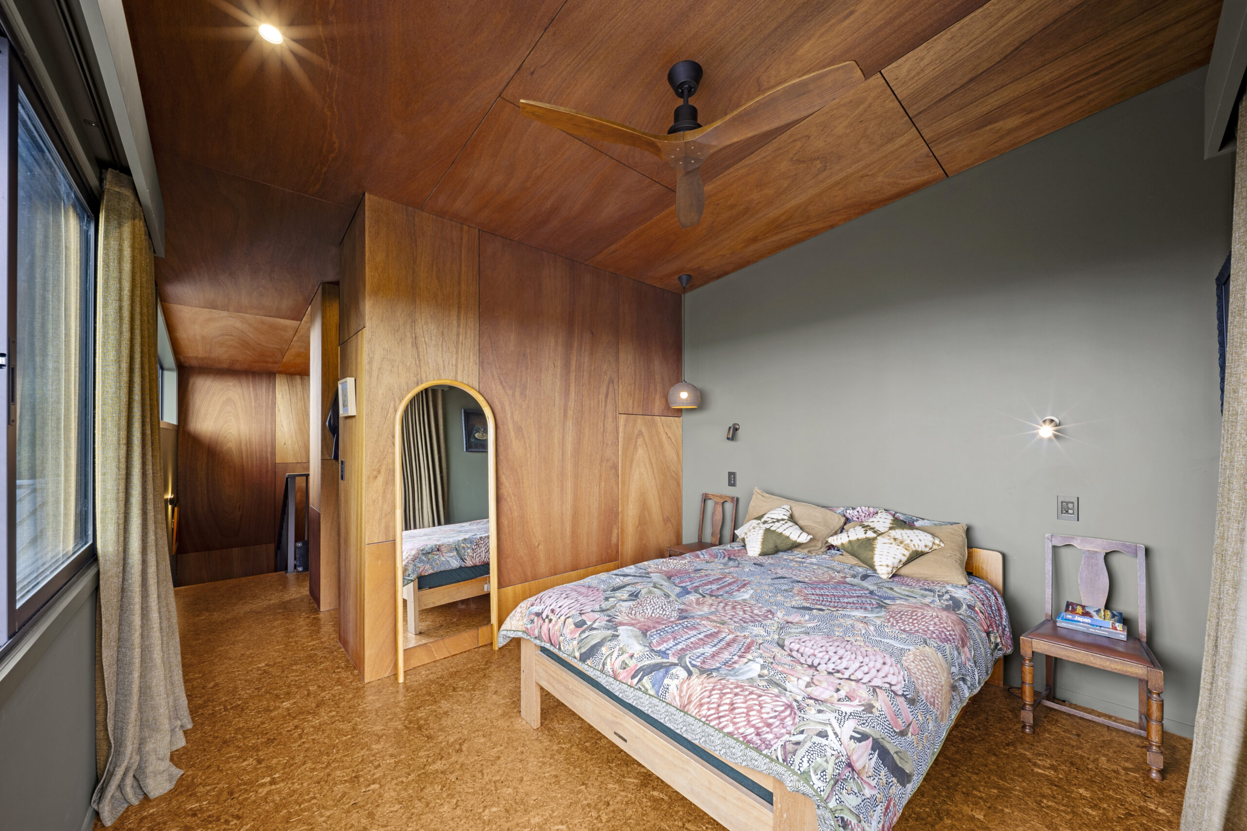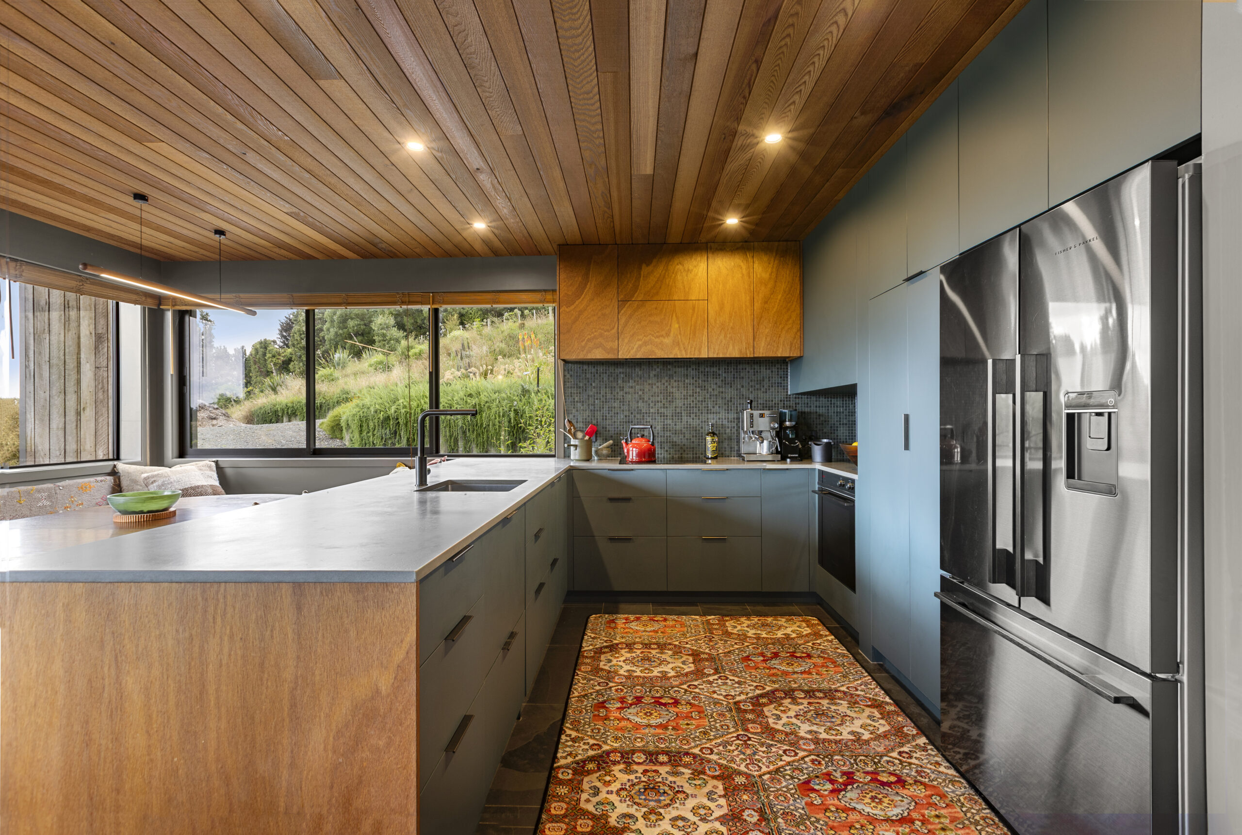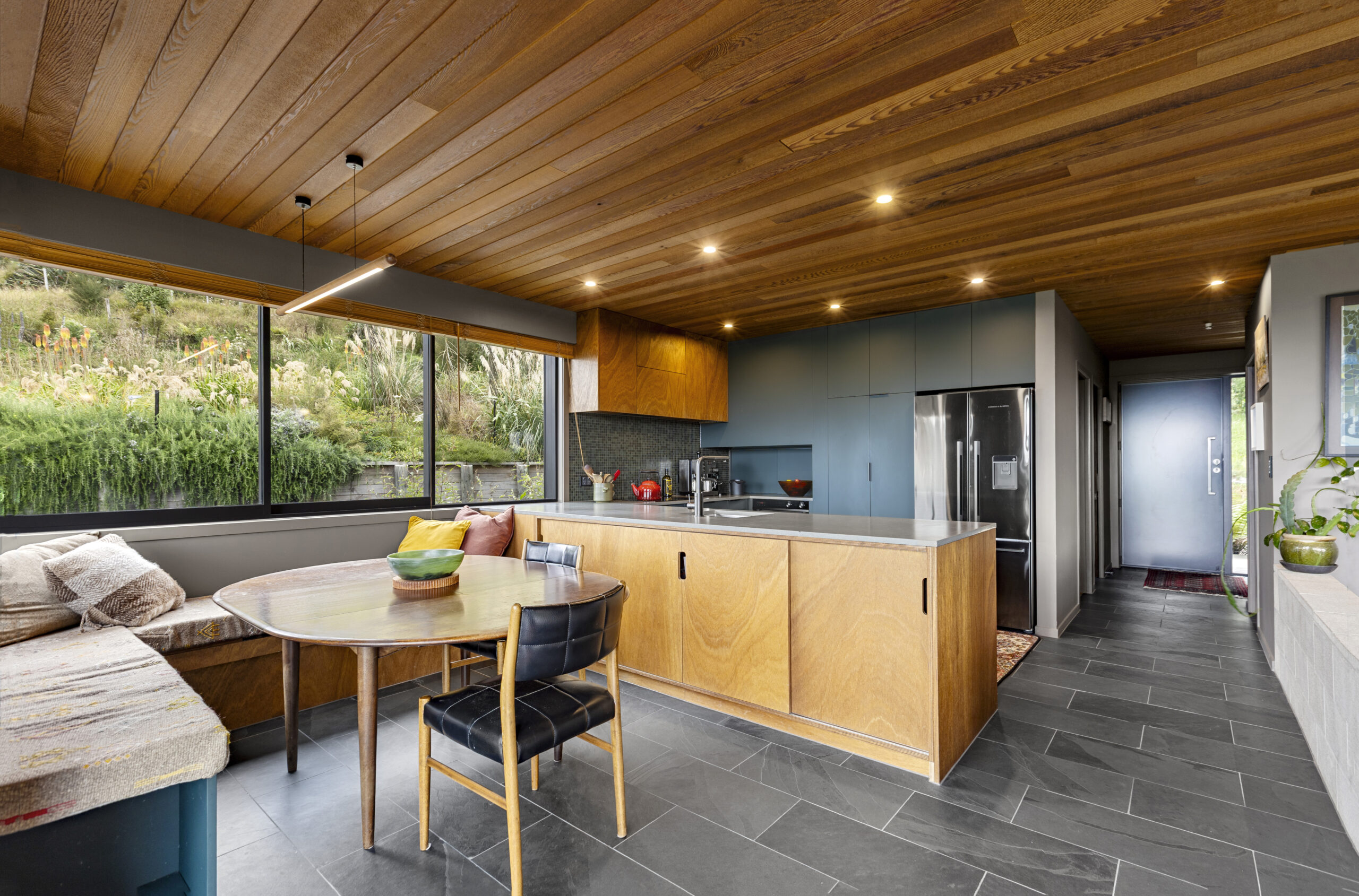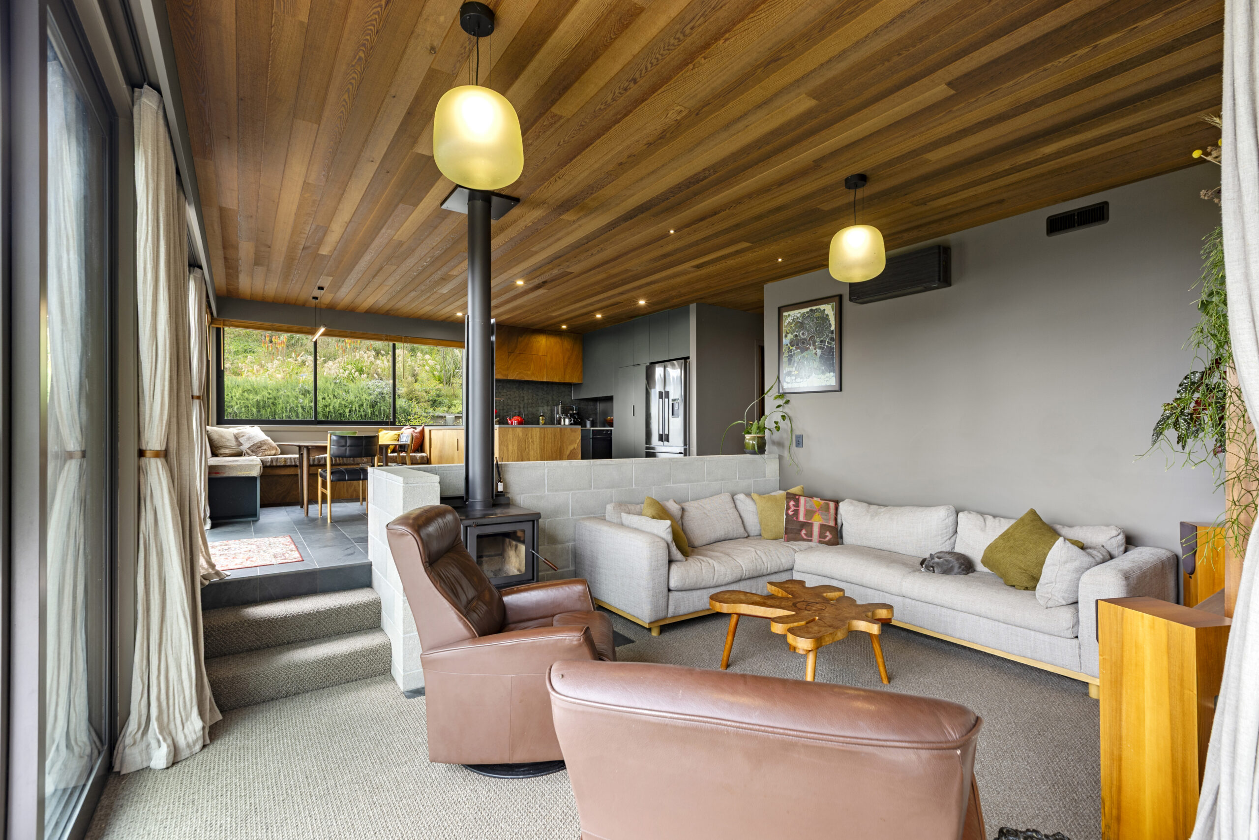 Veronica our client, a landscape architect, brought incredible passion to the project. She carefully researched and selected products to suit her vision, from OSB flooring and Australian hardwood decking and cladding, to the tongue-and-groove cedar ceiling flowing through the open-plan living spaces not to mention the plywood linings with bold negative detail.